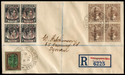 on locally addressed registered cover from Singapore (Syonan); the adhesive in combination with 1c Straits Setts. blk.of 4 (SG.J146) and 5c Perak blk.of 4 (SG.J275); all tied by 'SYONAN - QUEEN STREET cds's and with censor chop on reverse. -