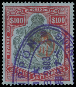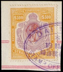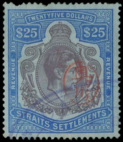 Script Wmk, Perf 14, KGVI Revenues handstamped Type 11 (Okugawa seal) in red, fiscally used with 'DAI NIPPON / STAMP OFFICE PENANG' datestamp. The $25 with a few perf faults, the $500 superb used on piece. All with BPA Expert Certificates. -