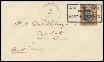 carried on Royal Air Corps survey flight by Southampton flying boat, franked $1.00, b/stamped 22 June; also 21 June 1930 Sandakan - Jesselton, franked 50c and b/stamped 25 June. (2) -