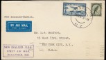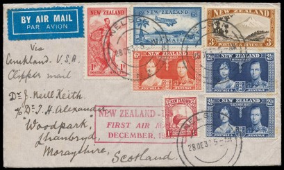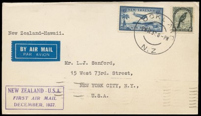 incl. 2 Jan.1938 postcard franked 2/3? from Auckland - Pago Pago - San Francisco by 'Philippine Clipper' via Hawaii, letter franked 4/6 carried on same flight; also letter to Scotland franked 4/6 plus 1d late fee, postcard to USA franked 1/6, intermediate leg covers Auckland - American Samoa franked 6d and Auckland - Hawaii franked 3/-, all carried on the same flight. Cachets in red, purple & black. (6) -