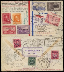 having been carried by ÔYankee Clipper' to New York across the Atlantic, domestic service to San Francisco, ÔChina Clipper' to Manila and re-posted to Leipzig with delivery by PAA to Hong Kong then Air France to Marseilles. An interesting cover with all relevant postmarks. -
