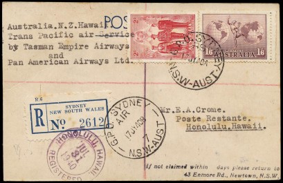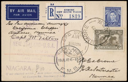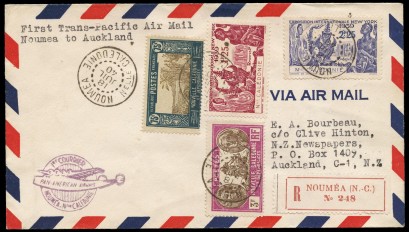 FAM19 San Francisco to Auckland, together with group of intermediates & connecting flights incl. 18 July 1940 (AAMC.905b) Ulm card (1 of 10 flown) for return flight of ÔAmerican Clipper' to Noumea and similar card (1 of 15 flown) to Honolulu. Interesting group. (10) -