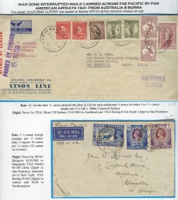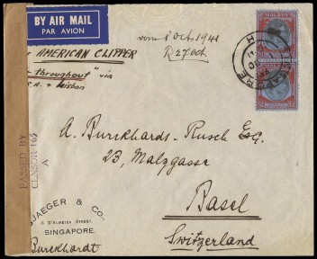 incl. Jan.1941 Sydney - England at triple rate of 17/6 & April 1941 single rate cover at 5/10, Jan.1941 Basel - Sydney franked at double rate 3F70c, two covers Australia - USA at 11/10 and postcard rate of 2/10 to Hawaii, Oct. 1941 Burma - Scotland and Singapore - Switzerland franked $2. -