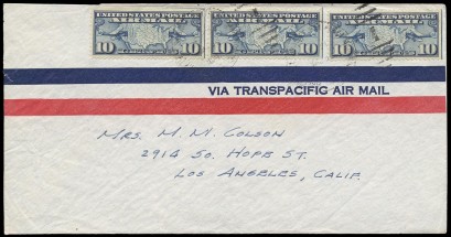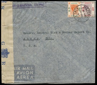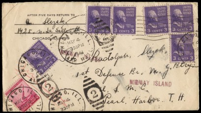 paid 30c rate; 4 May 1941 Chicago - Midway Island, 20c rate paid with 'MIDWAY ISLAND' straight line handstamp; 14 May 1941 Hong Kong - Ohio, paid $7 (double rate). (3) -