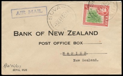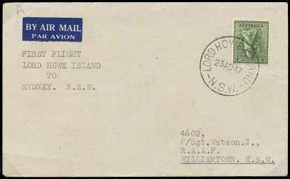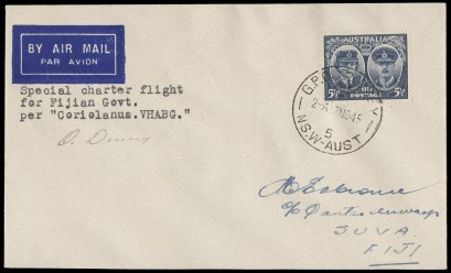 by flying boat, including 17 Nov.1945 (AAMC.1014,1015) Sydney - Fiji & return flight, 1 Jul.1947 Suva - New Zealand, 23 Aug.1947 (AAMC.1106b) Lord Howe Island - Sydney, May 1948 Ocean Island - Dunedin, 21 Jun.1949 Rabaul - Jacquinot Bay, 2 Jun.1950 Christchurch - Fiji, 3 Oct.1950 (AAMC.1250), Dec.1951 Auckland - Papeete and 7 Oct.1952 Auckland - Apia. (12) -