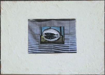 Unsigned mixed media transfer of linocut with scumbled frame, Label LM misc 35. -