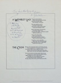 A flyer containing two poems by the celebrated British poet, this one inscribed to Morley as ‘my ally in architecture’, with additional lines just for him, and signed by the poet upper right. The new lines read ‘I made hay while the sun shone; My writing sold; Now if the harvest’s over/And the world cold/Let me not cease to be grateful/As I lose hold’.