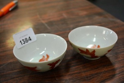 Lot Description:Unusual pair Chinese iron red 'goldfish' wine cups Qianlong marks