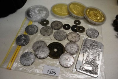 silver coloured etc plus 4 larger coins or medals in perspex cases and a white metal plaque showing a wiseman with character mark to undersride, 23 pieces -