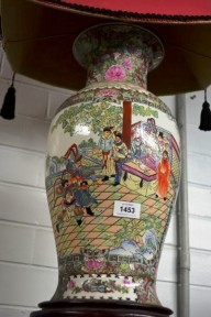 famille rose decorated with court scene, converted to a table lamp with timber fittings, base height is 52cm, comes with a red & black oriental shade with tassles -