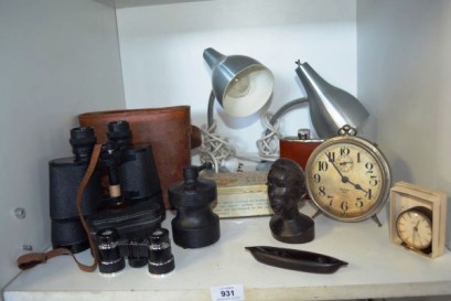 2 pairs of binoculars incl. Zenith, 2 silver and blue anodised desk lamps, pepper grinder, vintage tin -