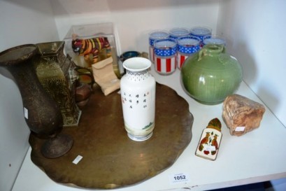 vases, soapstone figurine of a tiger, 6 stars and stripes bourbon glasses, mineral specimen -