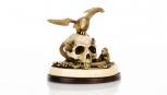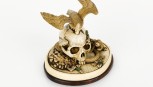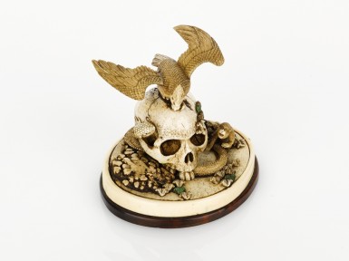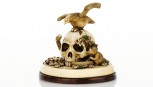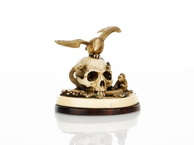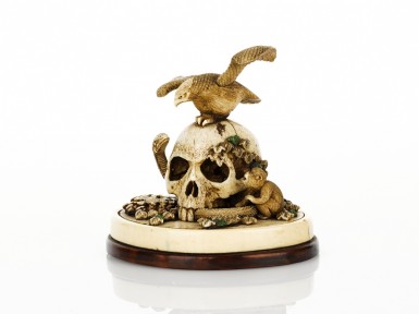carved stag antler okimono of a skull with entwined snake, surmounted by a hawk, monkey to one side, Japanese character marks to underside