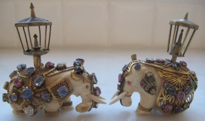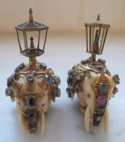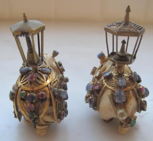 the gilt howdahs set with semi precious stones including moonstone, rubies, emeralds, sapphires measure 6cms x 6.2cms Ht -