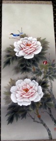 Lot Description:Oriental watercolour silk scroll bird and flowers