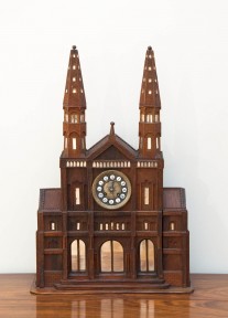 Lot Description:An unusual carved walnut, mirror glass and enamel architectural clock, French, circa 1900