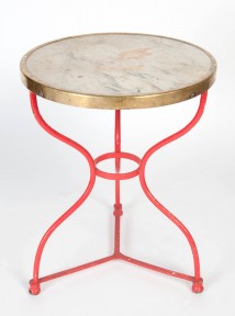 Lot Description:A red painted and brass mounted carrara marble patio table, French, circa 1880