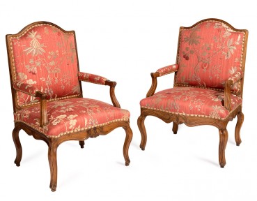 Lot Description:A fine pair of Louis XVI walnut armchairs, French 18th century, upholstered in pink pomegranite silk with chequered silk on the reverse