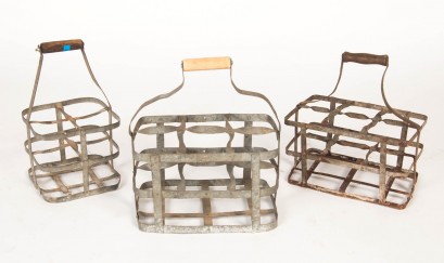 Lot Description:A collection of three zinc and wood wine bottle carriers, French, 19th century