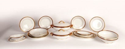 Lot Description:A fine quality Limoges gilt and blue rimmed white porcelain dinner service comprising 69 pieces, French, circa 1900