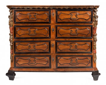 Lot Description:A part ebonised and polychrome painted and carved four-drawer commode,