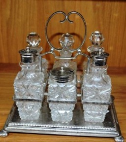 Lot Description:6 bottle cut glass cruet set with silver plate mounts on a silver plate stand with engraved shield 'K.T.A. & R.C. 1st