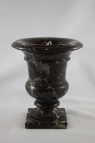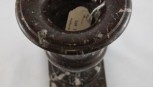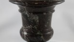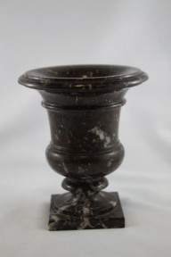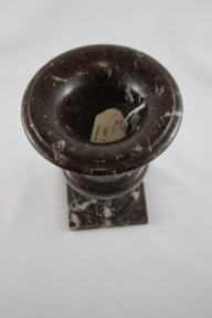 of classical form, with a stepped spreading lip, and circular support on a square foot, in tones of brown, black and white, h 13.5cm -
