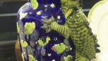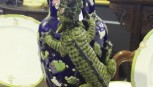 beautifully decorated with applied dragon to the body on a ground of stars and clouds in strong tones of green, pink, white, yellow and cobalt, h 69cm -
