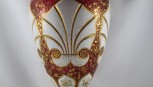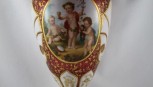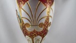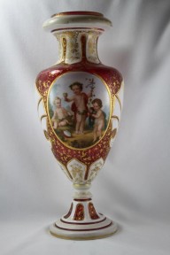 in milk and ruby glass, painted with central panel of painted putto, surrounded by raised anthemion motifs, with a gilt scrolled vine ground, the whole on a circular foot, h 36cm -