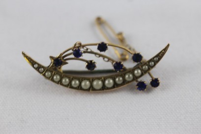 Lot Description:Victorian 9ct Gold, Seed Pearl and Sapphire Brooch