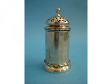 hallmarked, Birmingham, 1902, Barraclough & Co, Leeds, comprising covered mustard pot, pepper shaker and two later salt spoons, the whole of facetted cylindrical form accented with a leaf and berry border, (4), -
