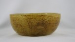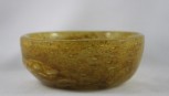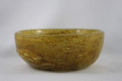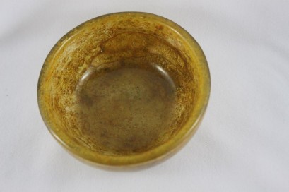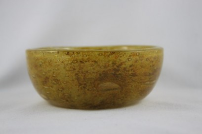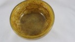 of circular form, in a mottled mustard coloured glass, original paper label verso, d 11cm -