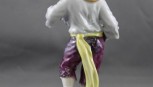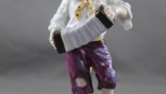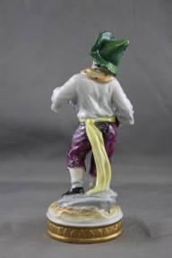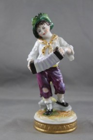 depicting a young boy wearing a hat playing an accordion, in tones of green and purple, underglaze blue factory mark, h 15cm -