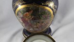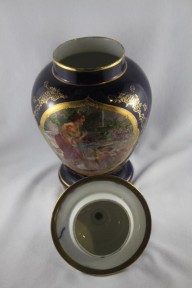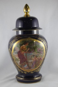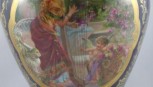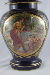 of baluster form, decorated with a scene of a lady playing a harp with cupid, surrounded by cobalt ground accented in gilt, h 30cm -