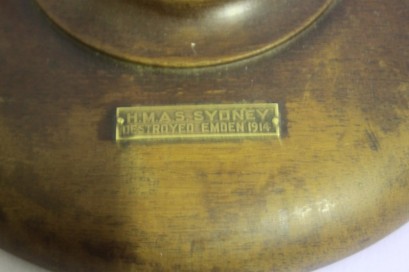turned stand on circular platform base, with mounted base plaque inscribed 'HMAS Sydney Destroyed Emden 1914', h 77cm -