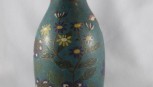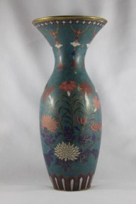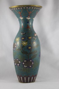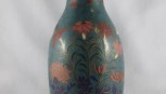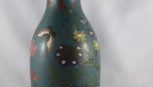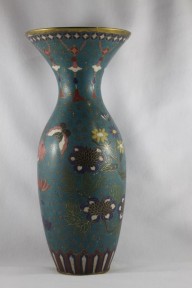 with spreading lip of ovoid form, decorated with butterflies and flowers, in tones of red, pink, white and green on a blue ground, h 27cm -