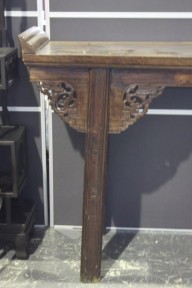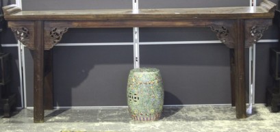 of rectangular form with carved and pierced brackets on four legs united by stretchers -