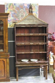 with a pitched roof, carved with figural finial, decorated with raised box wood and stained bone figures, above three shelves with fret work aprons, 237cm x 104cm -