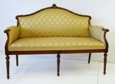 Satinwood & kingwood marquetry with camel back & scrolled arms on 6 tapered and fluted legs. Yellow silk upholstery.