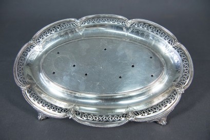 Sheffield 1865, makers Hy Wilkinson & Co. Quad footed with pierced decoration. Engraved dedication underside dated 19th December 1865.