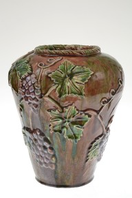 with appiled grape and vine leaf, signed to base, firing cracks -