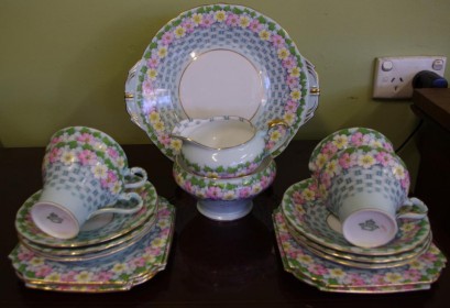 Floral basket pattern to include four cups (one AF), six saucers, five plates,sugar/creamer and a cake plate -