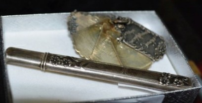 incl. Art Nouveau pencil holder and case with floral decoration, and a small pendant with fold-out sleeves, engraved with various names and dates of birth etc. to remember birthdays -