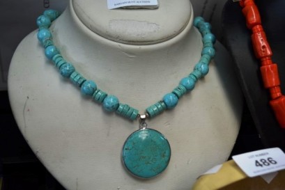 Lot Description:A ladies turquoise coloured necklace with a central round bezel set pendant