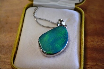 Opal is a free-form, pale blue/green opal with a bale top. Length = 4.4cm. Weight of pendant = 7.6g -