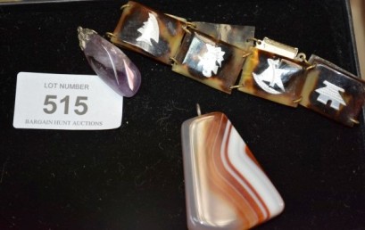 a free form amethyst pendant with silver plated top and a turquoise shell inspired bracelet with a silver plated clasp, some rings missing to the attached links -