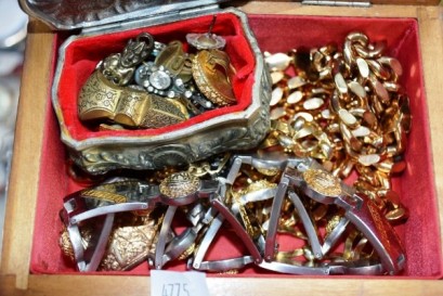 to incl. a large curb link gold costume jewellery necklace & bracelet set, a silver and gold coloured Versace necklace, a silver plated dagger brooch, a seahorst brooch also silver plated, a silver plated box with multiple clip on earrings etc. -