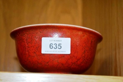 Lot #635 - Unusual red crackle glazed Chinese rice bowl with 6 blue character marks to underside