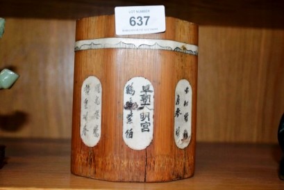 octagonal shaped with engraved inlaid panels, some AF, cracks to base etc, H 13cm -