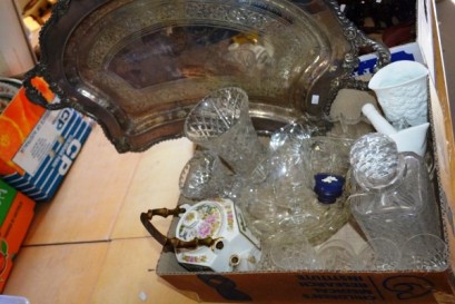 Japanese swing handle teapot, pressed glass vase, ceramic mortar pestle, elaborate EPNS kidney shaped serving tray with etched design - width 70cm -